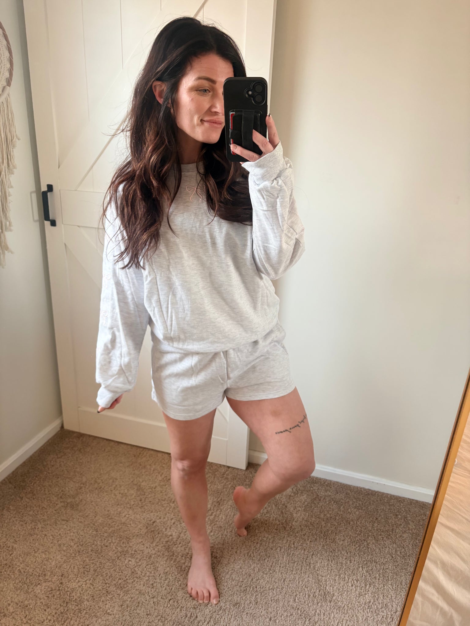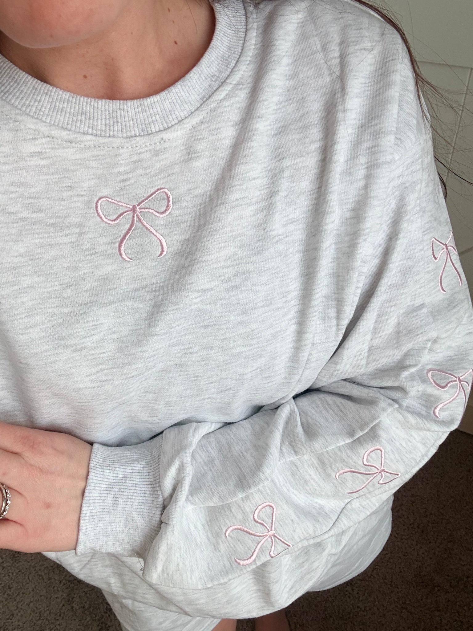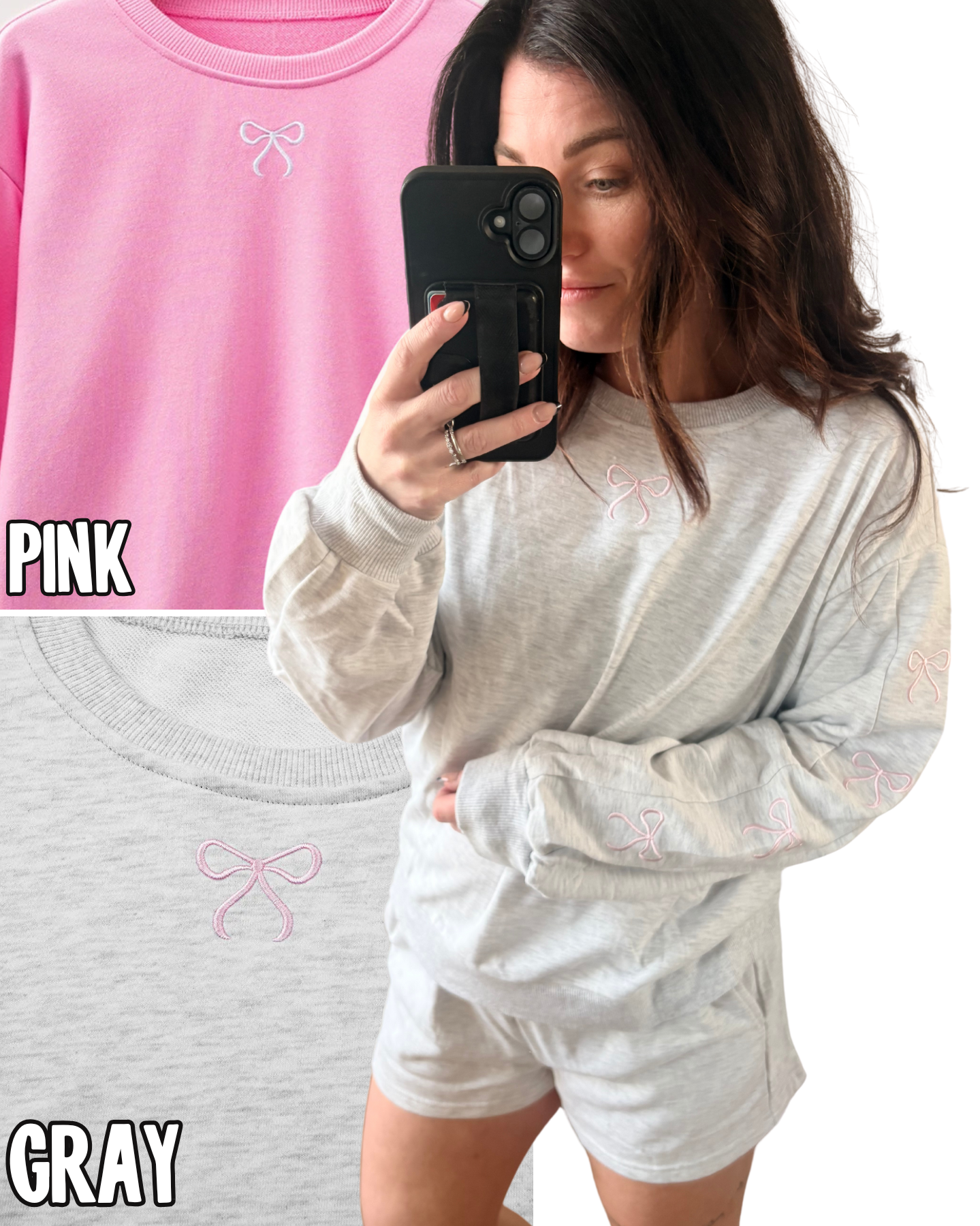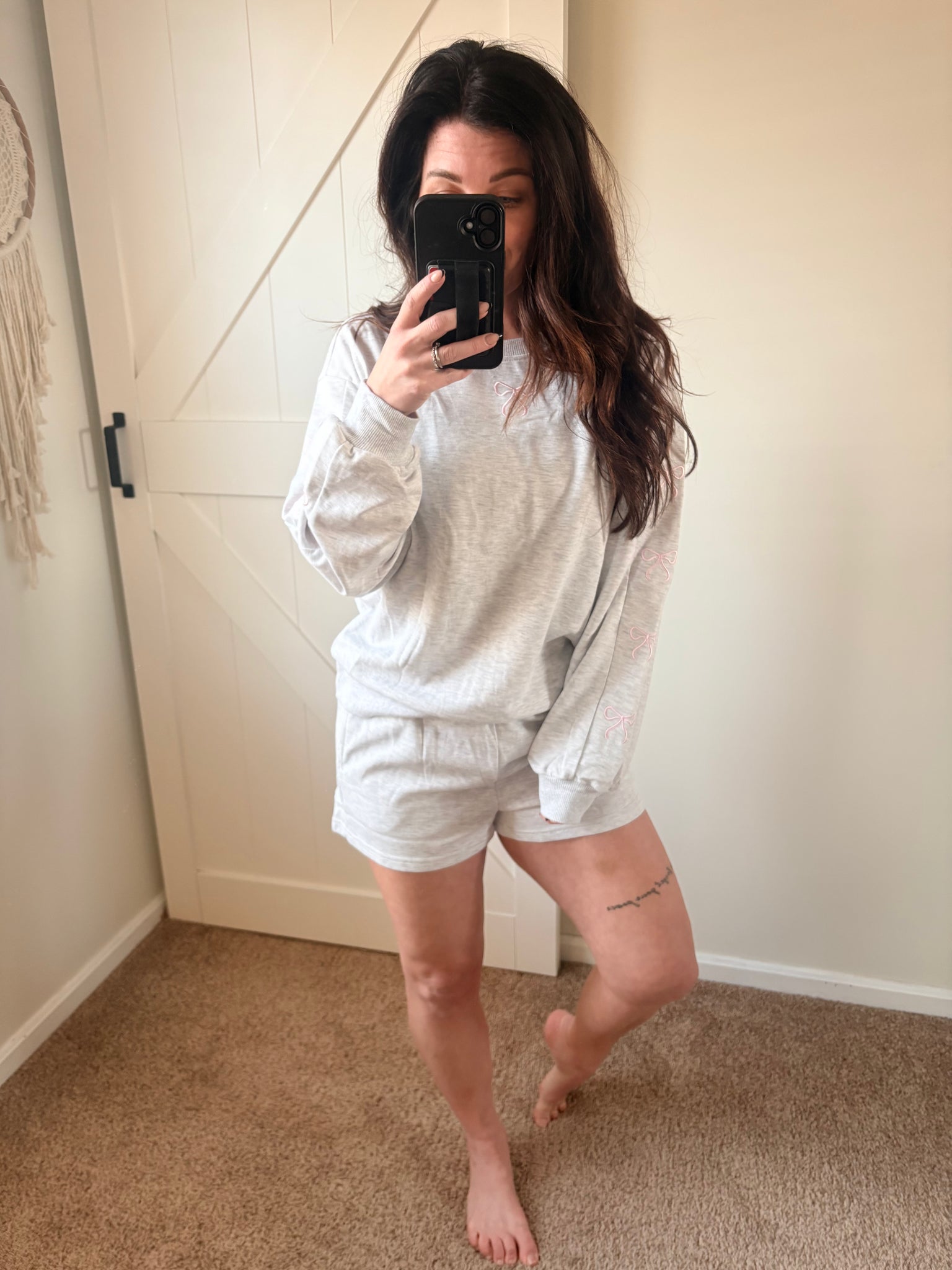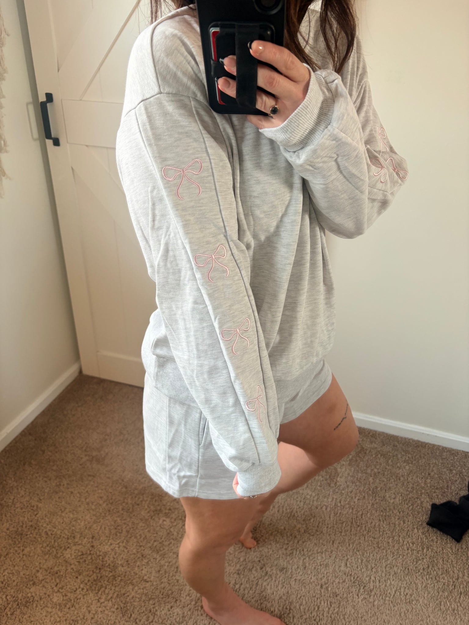 Meet your new favorite lounge set. The Bow Bliss Lounge Set includes a cozy pullover sweatshirt and matching shorts, both finished with delicate embroidered bow details for the perfect touch of sweet style. Designed with a relaxed, comfortable fit and ultra-soft fabric, this set is made for lounging, casual days, and feeling cute without trying.