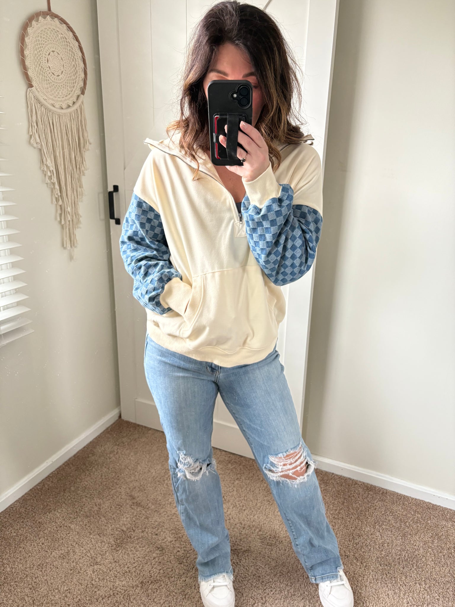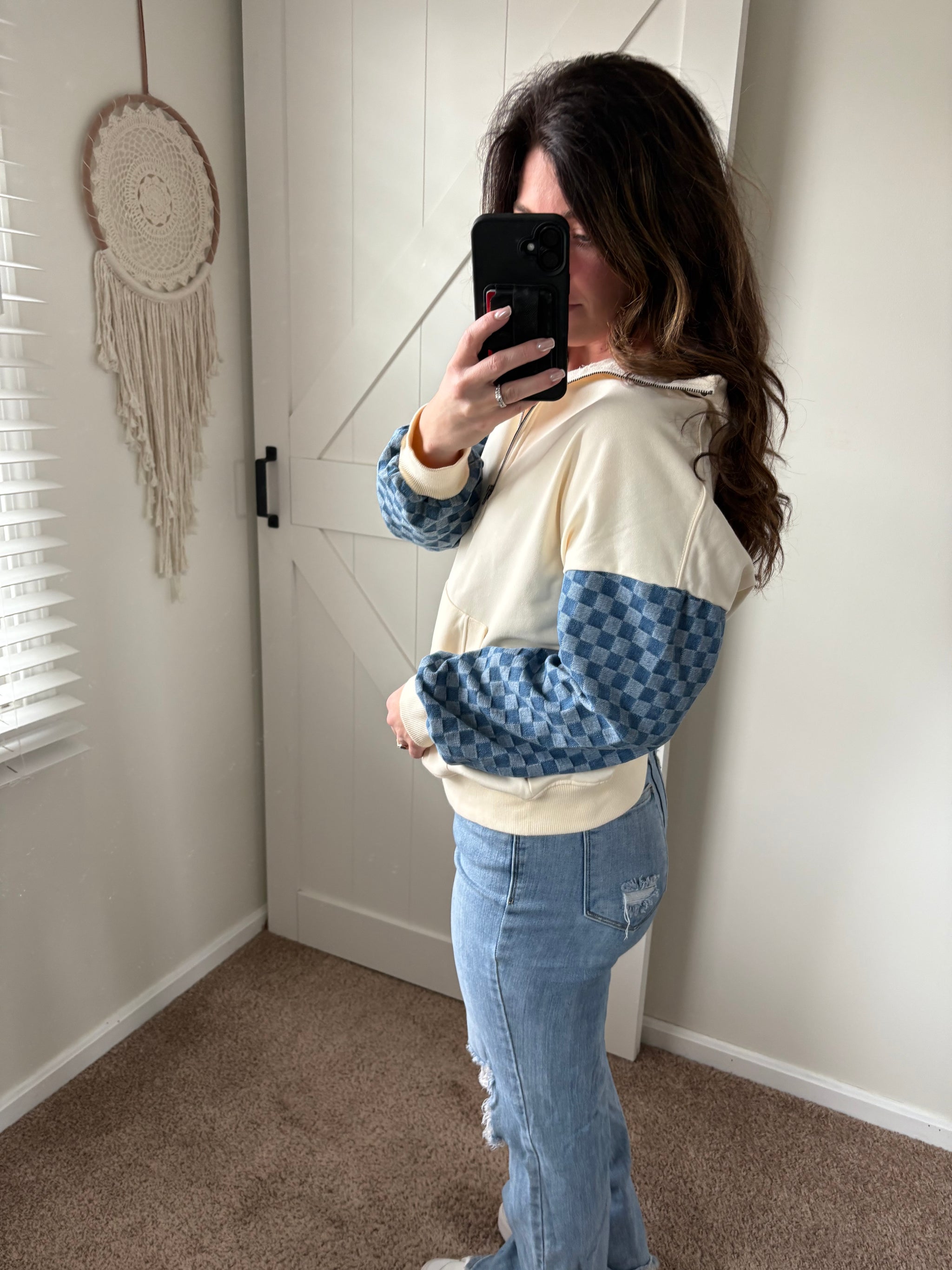Step into playful comfort with the Checkmate Colorblock Hoodie — the perfect mix of sporty and fun. Featuring bold checker-pattern sleeves, a half-zip neckline, and a cozy kangaroo pocket, this hoodie brings a pop of personality to your laid-back looks. Whether you're running errands or lounging at home, it’s the ultimate blend of comfort and cool.