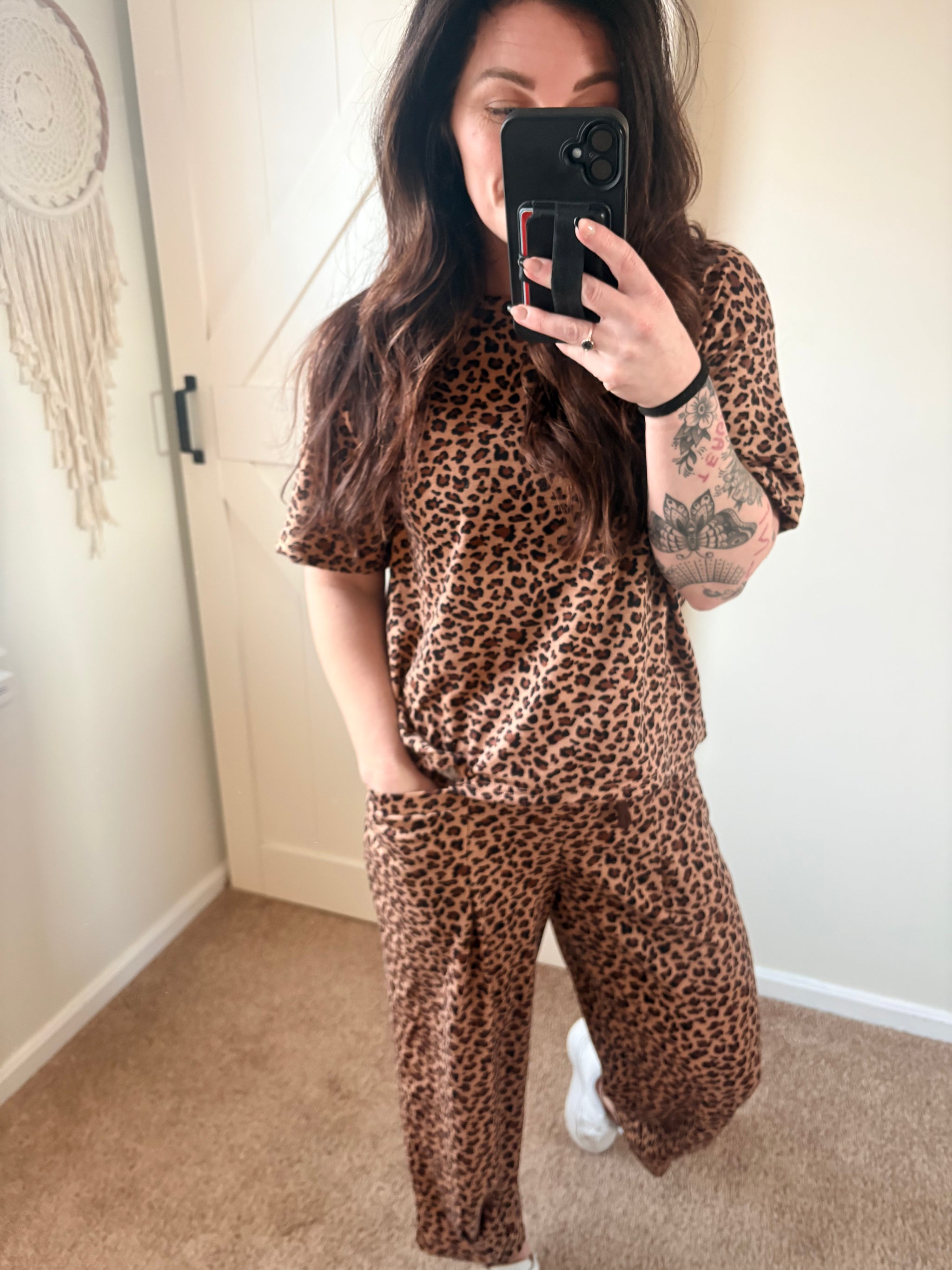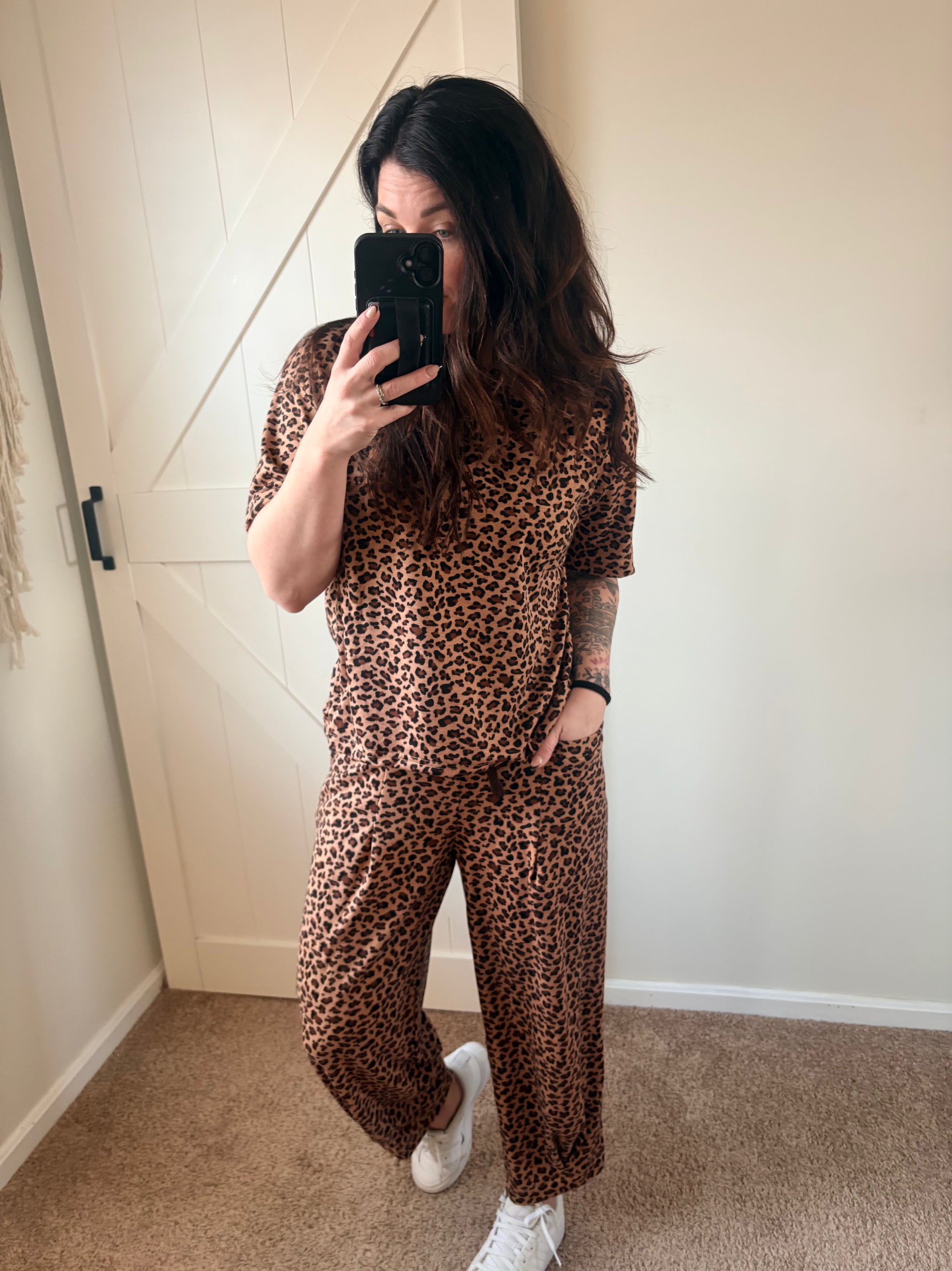 Effortless comfort meets everyday style in the Wild Ease Barrel Lounge Set. This two-piece set features a relaxed leopard print top paired with ankle-length barrel pants for a modern, elevated fit. Designed with a soft, lightweight feel and an easy silhouette, this set is perfect for lounging, errands, or casual days when you still want to look put together.